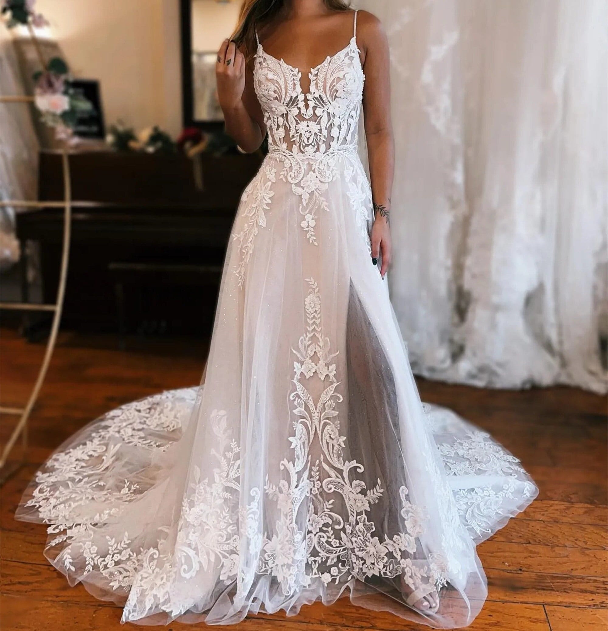 Wide Spaghetti Straps with Lace A-line Left Slit Wedding Dress Appliques Lace Br